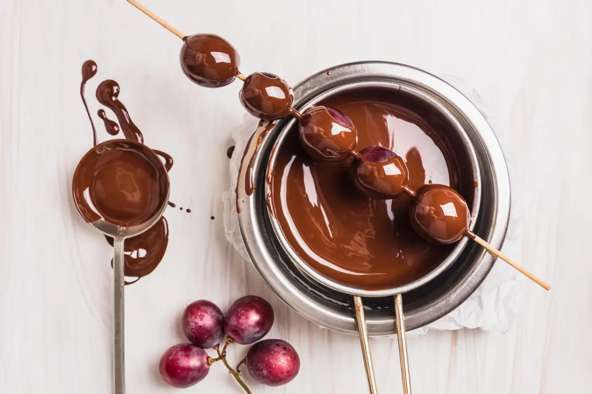 Coloque o chocolate em um recipiente e derreta no micro-ondas por 30 segundos. Em seguida, espete as uvas nos palitos e mergulhe-as no chocolate derretido, garantindo uma cobertura uniforme. Coloque os espetinhos em uma bandeja forrada com papel-manteiga e leve à geladeira até o chocolate endurecer. Sirva em seguida.