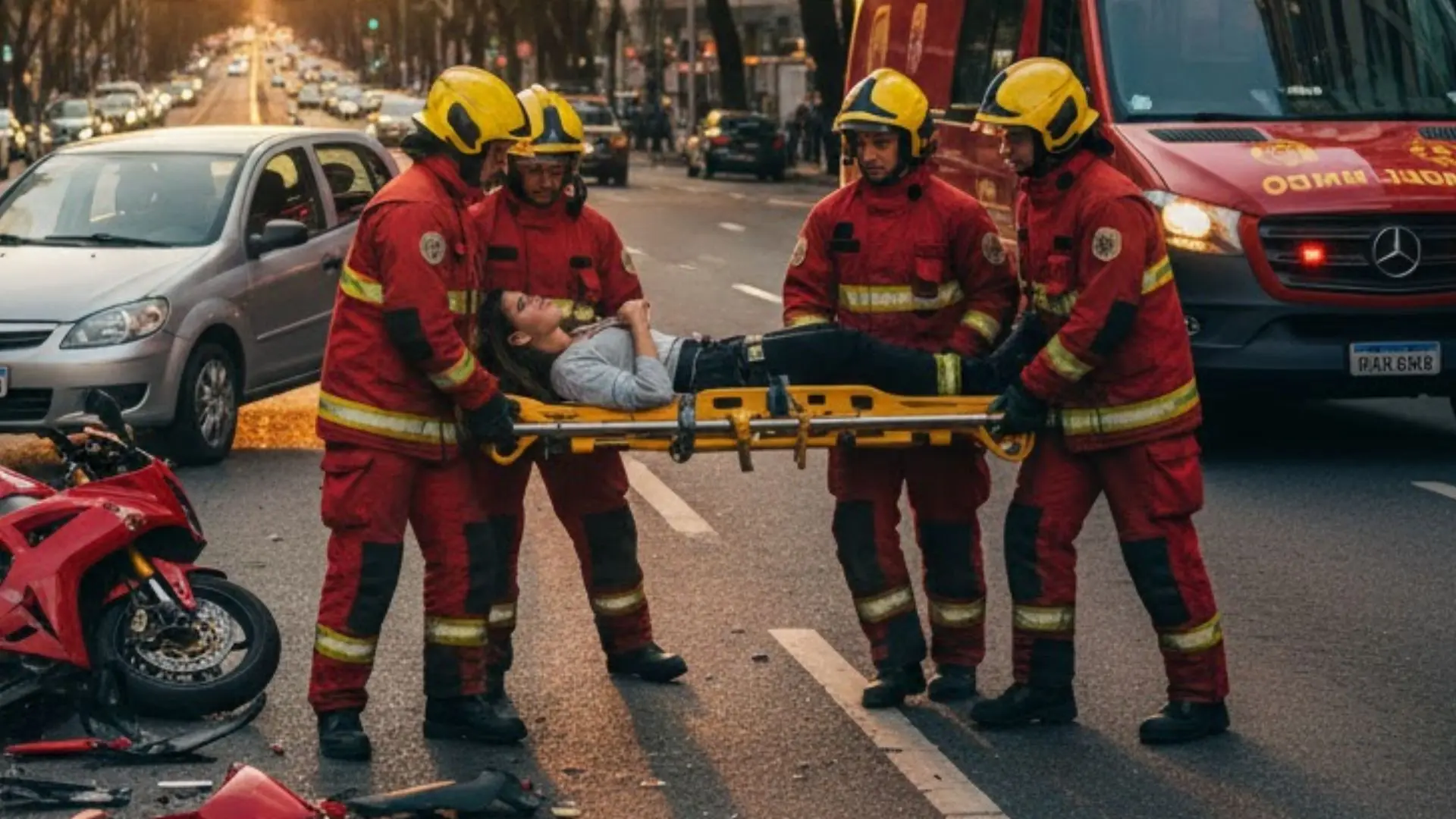 Com o impacto, a condutora da moto caiu e foi encontrada sentada no asfalto pela equipe de resgate. Ela apresentava dores no rosto, no joelho esquerdo e no ombro esquerdo.