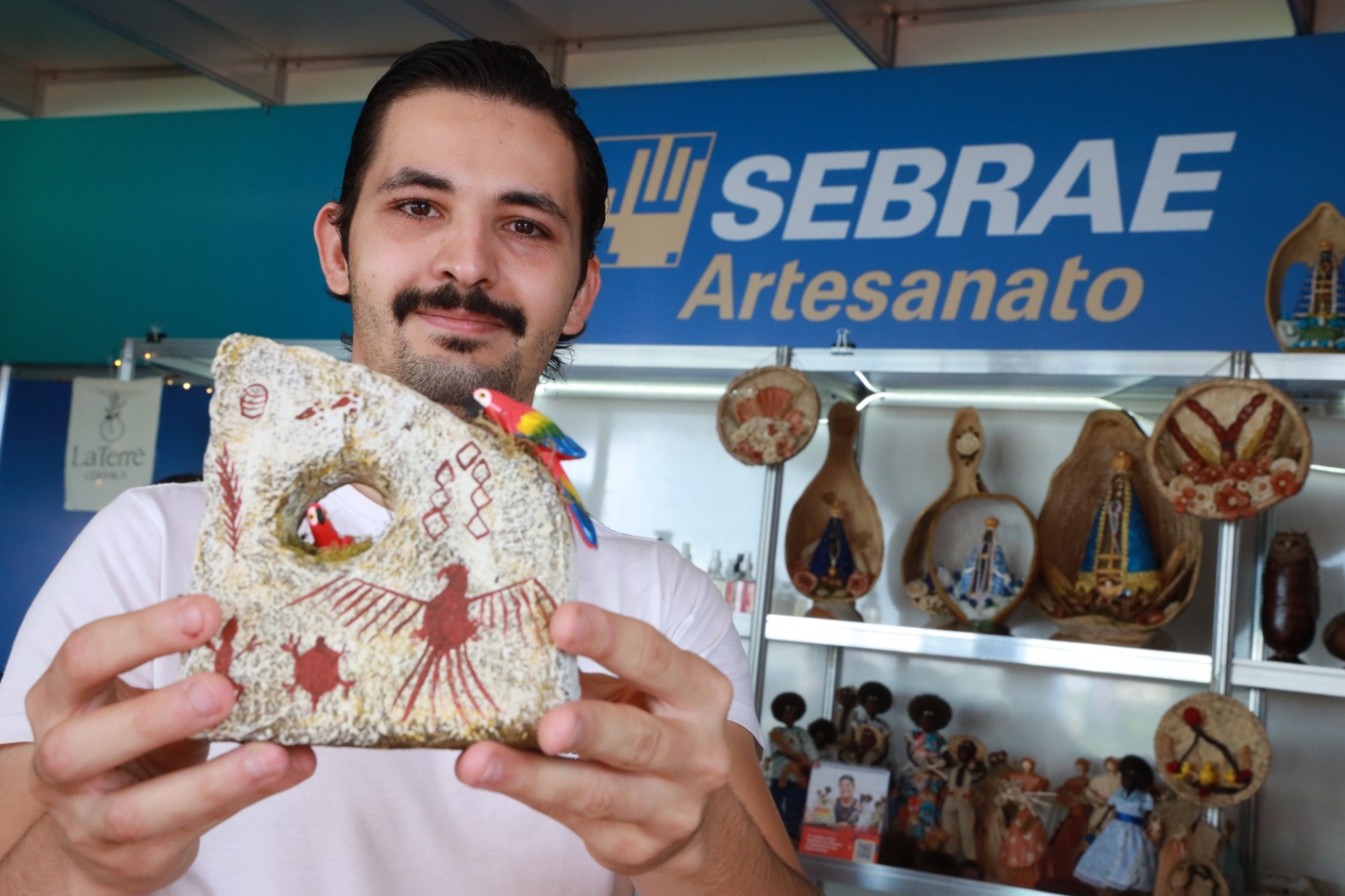 De Jataí, mãe e filho apresentam juntos o trabalho da Criativa Artesanatos, um projeto que traduz a riqueza do Cerrado em peças autorais. Vitor Mateus Krug Konhevaliki e Maria Aparecida Cunha Konhevaliki dividem a produção entre técnicas como papel machê e biscuit, sempre com um olhar atento à identidade regional. “A gente trabalha com materiais naturais, como cabaça, sementes, toquinho de árvore. Cada peça tem uma história, tem um significado. E tudo representa o Goiás que a gente vive”, conta Vitor. Entre as peças expostas, há corujas, capivaras, araras e referências à arte rupestre, todas reinterpretadas com uma estética própria.