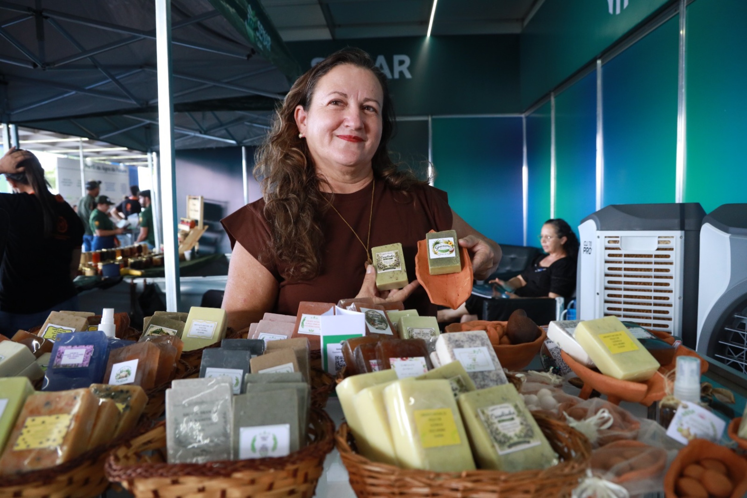 Também de Jataí, Ione Maria Oliveira leva para o estande um tipo diferente de cuidado: o artesanal voltado para a pele. À frente da marca Doce Aromas Oliveira, ela produz sabonetes, shampoos e cosméticos naturais a partir de plantas do Cerrado, resgatando saberes tradicionais. “É tudo feito do zero, sem químicas agressivas. A glicerina é produzida naturalmente no processo, então são produtos muito hidratantes. É um cuidado de verdade”, explica. Entre os ingredientes, estão espécies como carobinha, mutamba, guaxuma e pequi, além de óleos e argilas.