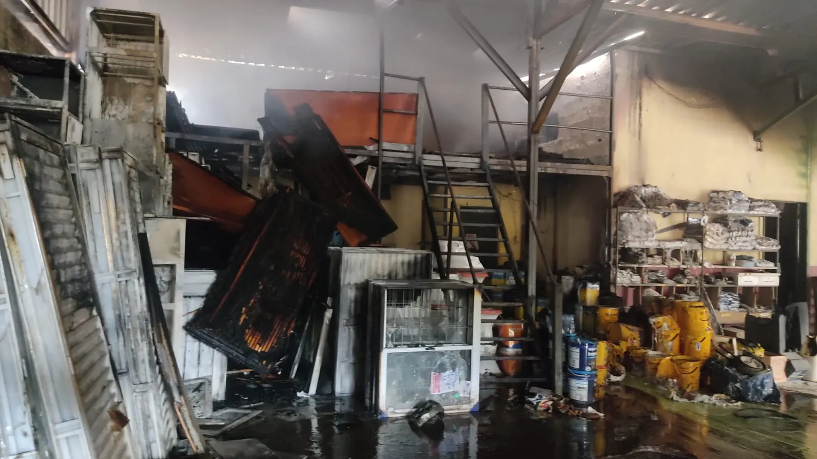 Ao chegarem ao local, os militares encontraram o estabelecimento tomado por uma fumaça densa, com foco principal de incêndio na área de depósito, onde estavam armazenados produtos inflamáveis como portas, janelas, latas de tinta, solventes e materiais diversos. Além do estoque, havia seis veículos no interior da loja, entre empilhadeiras e caminhões, que também ficaram sob risco de serem atingidos.