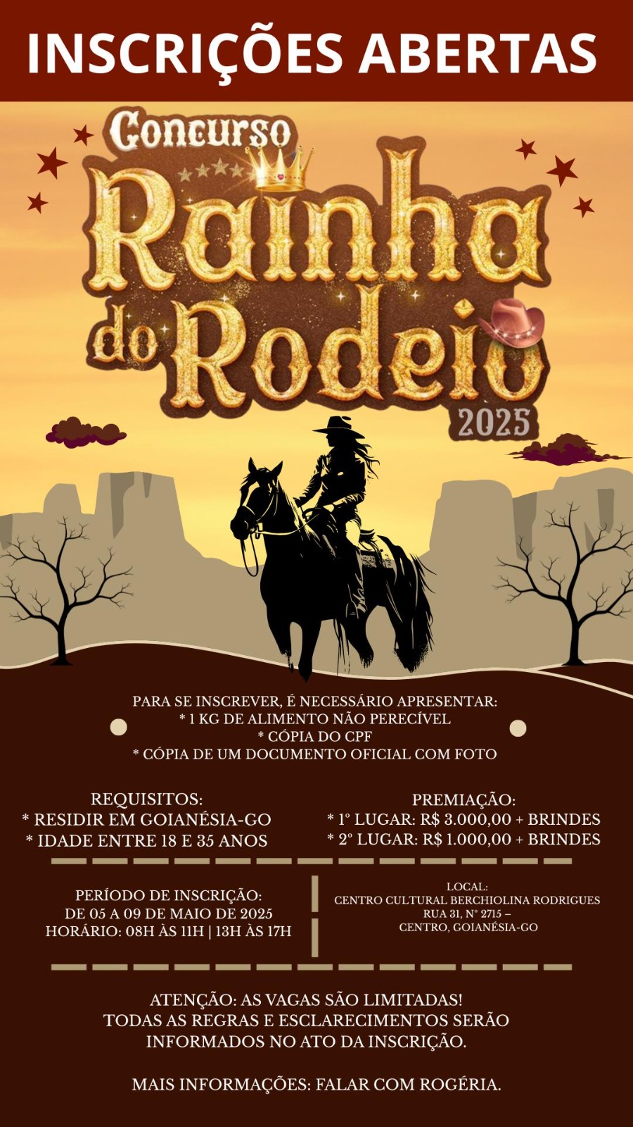 De acordo com os organizadores, o concurso é uma forma de celebrar a cultura sertaneja e dar visibilidade à força feminina na cidade. Para mais informações, as interessadas podem entrar em contato diretamente com Rogéria, responsável pela organização do evento.