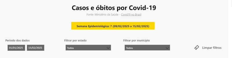 O Brasil registrou 108.410 novos casos de Covid-19 em 2025, considerando o período de 1° de janeiro a 15 de fevereiro. O intervalo corresponde às sete primeiras semanas epidemiológicas (SE) deste ano e representa uma alta de 52% ante os 71.479 registrados nas últimas sete semanas epidemiológicas de 2024, que engloba o período entre os dias 8 de novembro e 28 de dezembro. Os dados são do painel do Painel da Covid-19 no Brasil, do Ministério da Saúde.