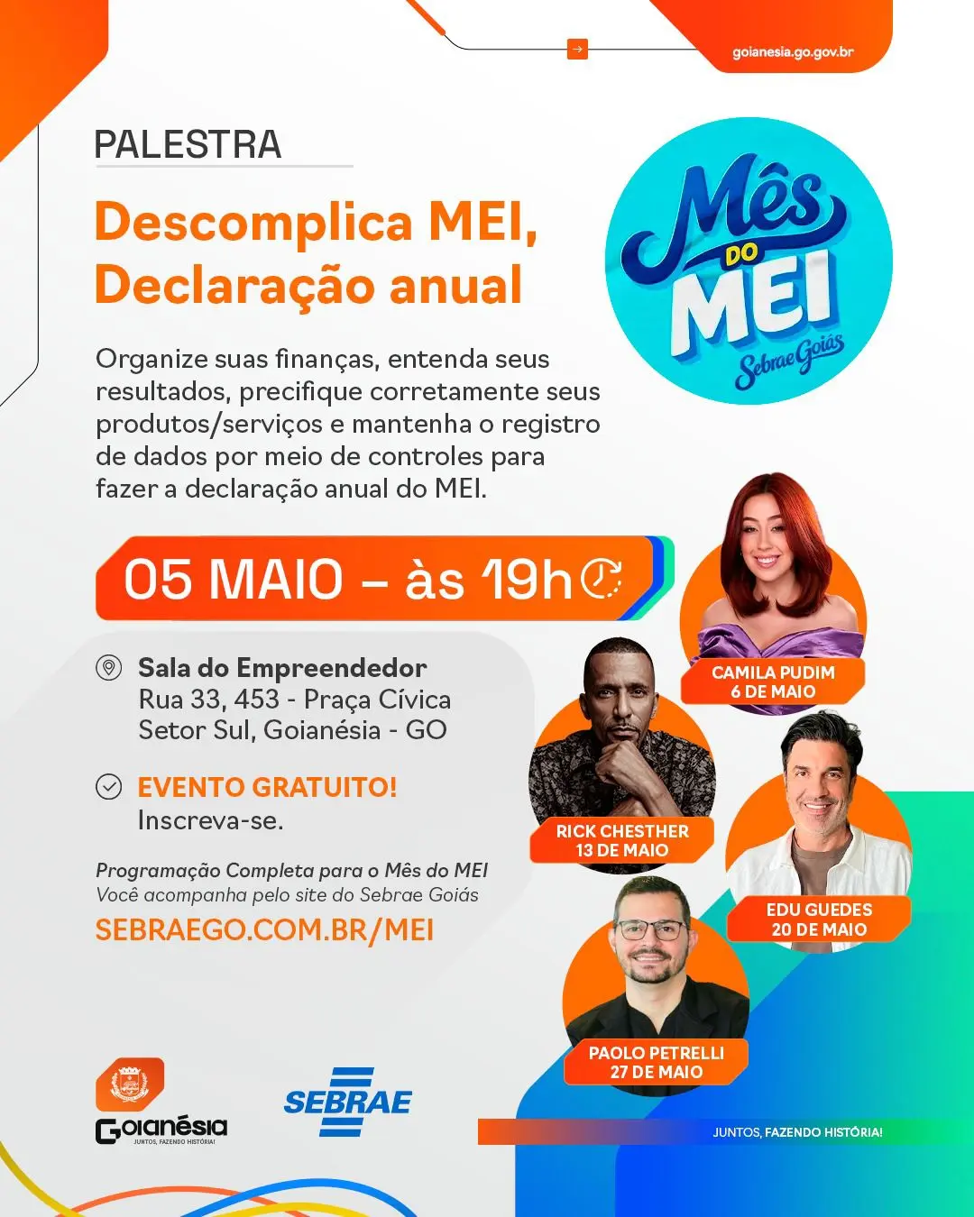 A iniciativa faz parte da programação do Mês do MEI, que contará com diversas atividades voltadas ao fortalecimento do empreendedorismo local. Ao longo de maio, nomes conhecidos também participarão de palestras na cidade, como Camila Pudim (06/05), Rick Chesther (13/05), Edu Guedes (20/05) e Paolo Petrelli (27/05).