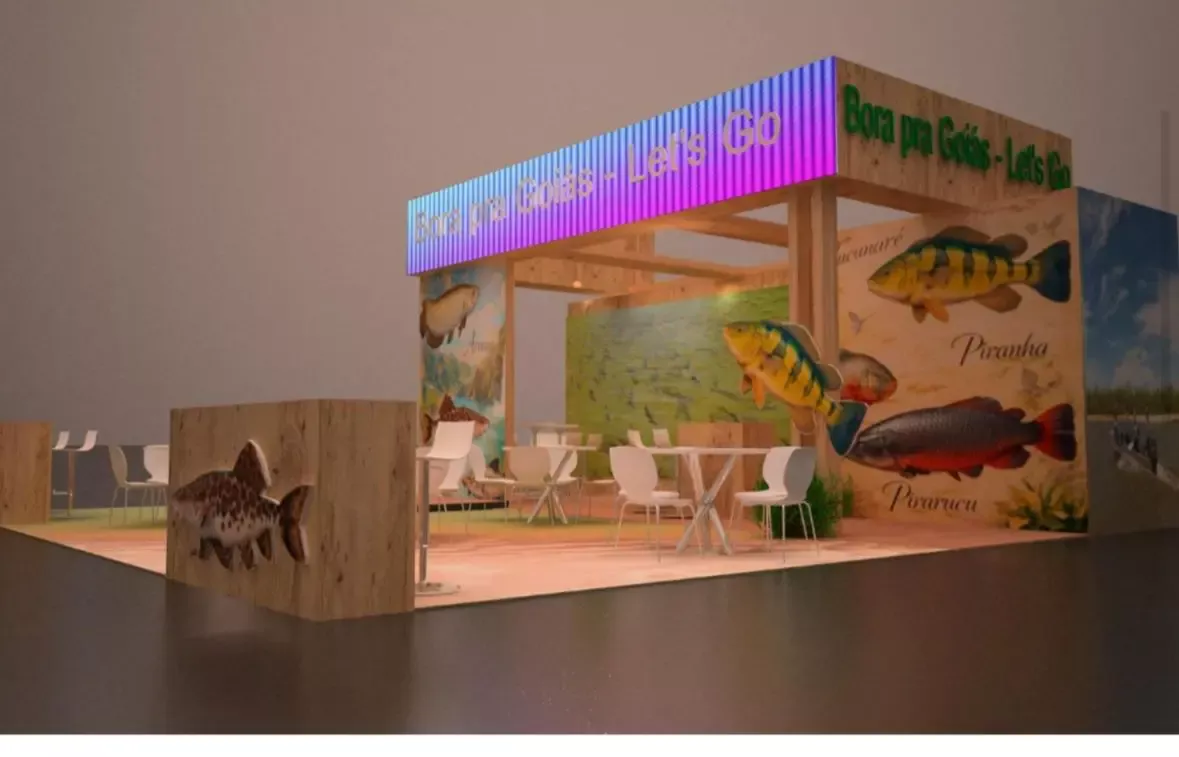 Todo em madeira, o estande possui 81m² dedicados a mostrar a força da Pesca Esportiva em Goiás. Na fachada e nos balcões, imagens de peixes como tucunaré e pirarara com led em volta, destacando as figuras.