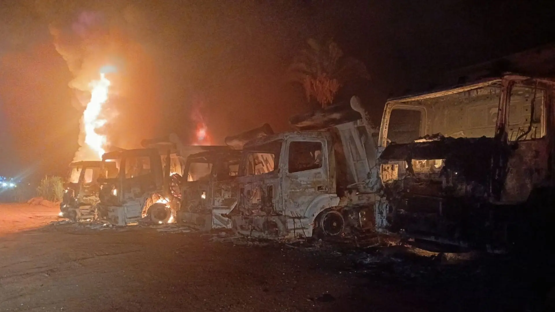 No local, os bombeiros constataram que nove caminhões estavam em fase avançada de queima, além de três máquinas pesadas, sendo duas em incêndio inicial e uma já isolada, evitando a propagação do fogo. O combate às chamas foi realizado com o uso do reservatório da viatura ABT-46, priorizando inicialmente as máquinas pesadas para conter o avanço do incêndio.