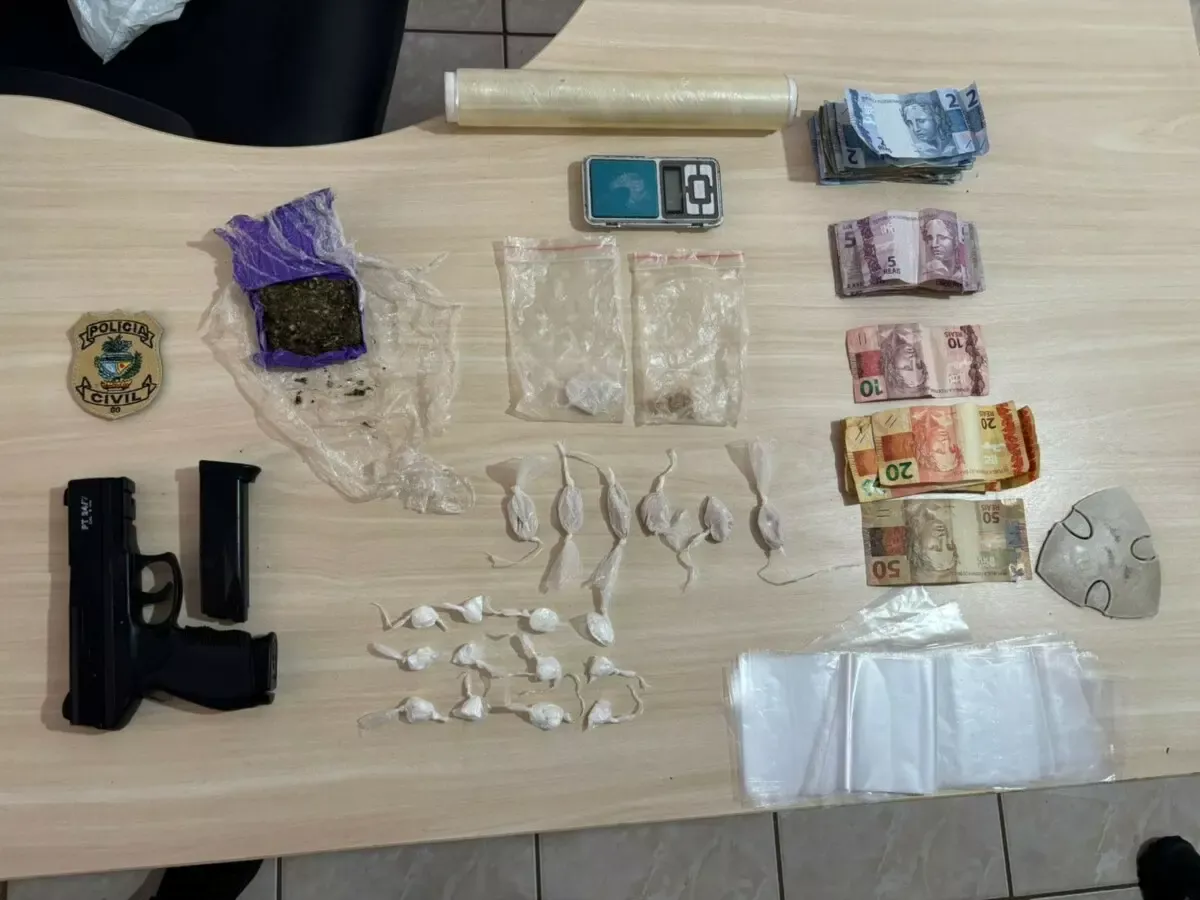 A Polícia Civil de Goiás, por meio da Delegacia de Polícia Ouvidor, com apoio da 1ª Delegacia Distrital de Polícia de Catalão – 9ª DRP, cumpriu, na manhã desta sexta-feira (03), um mandado de busca e apreensão em face de um investigado, de 19 anos de idade, numa residência alvo de apuração por tráfico de entorpecentes, localizada no centro da cidade. Após levantamento e investigação detalhada, a Polícia Civil representou pela cautelar, sendo esta deferida judicialmente. No momento da diligência, os agentes da PC localizaram diversas porções de drogas já fracionadas e embaladas para venda, um simulacro de arma de fogo, uma balança de precisão e relevante quantia de dinheiro em espécie.