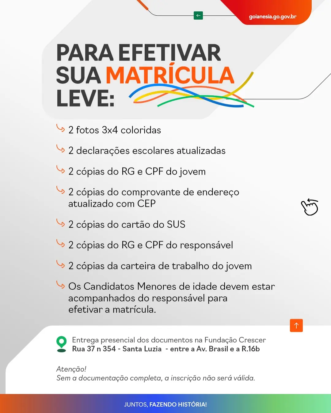 A entrega da documentação deve ser feita de forma presencial na sede da Fundação Crescer, localizada na Rua 37, nº 354, no bairro Santa Luzia, entre a Avenida Brasil e a Rua 16B, em Goianésia. É fundamental apresentar todos os documentos exigidos, pois inscrições com documentação incompleta não serão validadas.