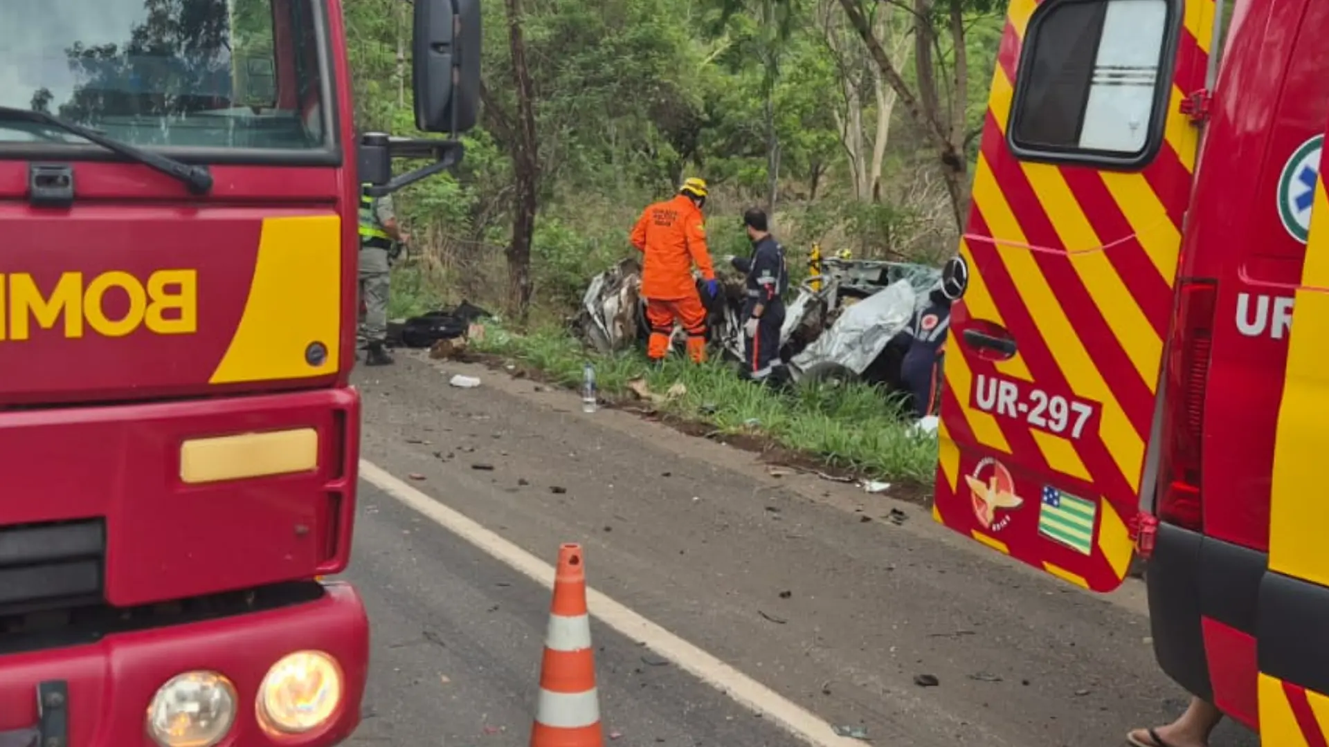 De acordo com o Corpo de Bombeiros, o chamado foi para uma colisão frontal entre três veículos, sendo dois de passeio e um caminhão, em um trecho de faixa contínua da GO-080. Foram acionadas três viaturas da corporação, além de duas do SAMU -uma de suporte avançado (USA) e outra básico (USB).