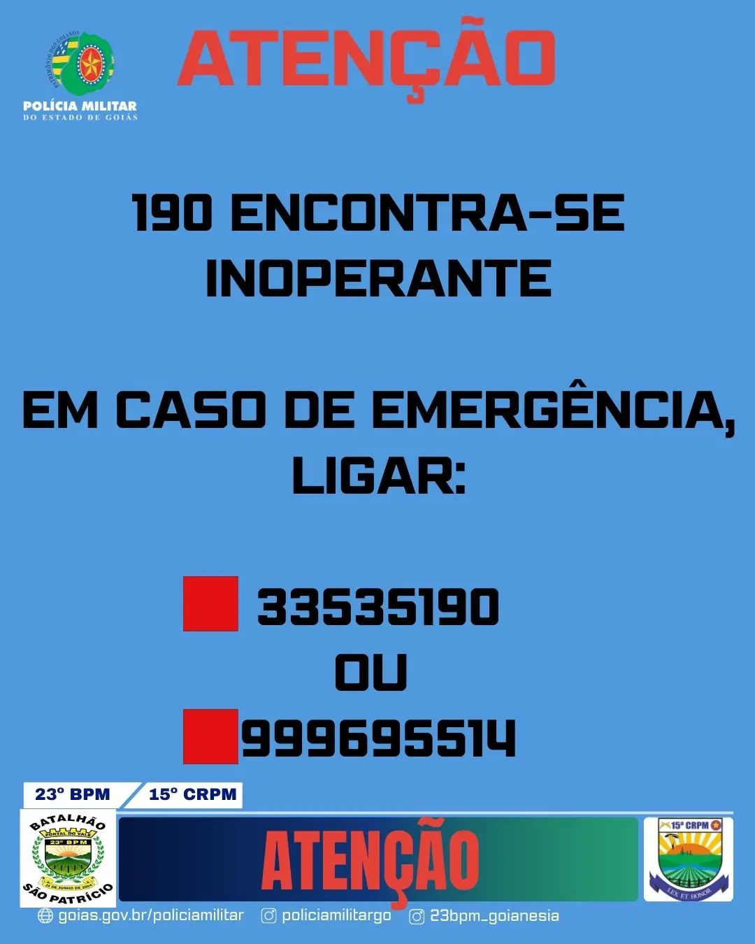 Em caso de emergência, o contato pode ser feito pelos telefones: (62) 3353-5190 ou (62) 99969-5514.