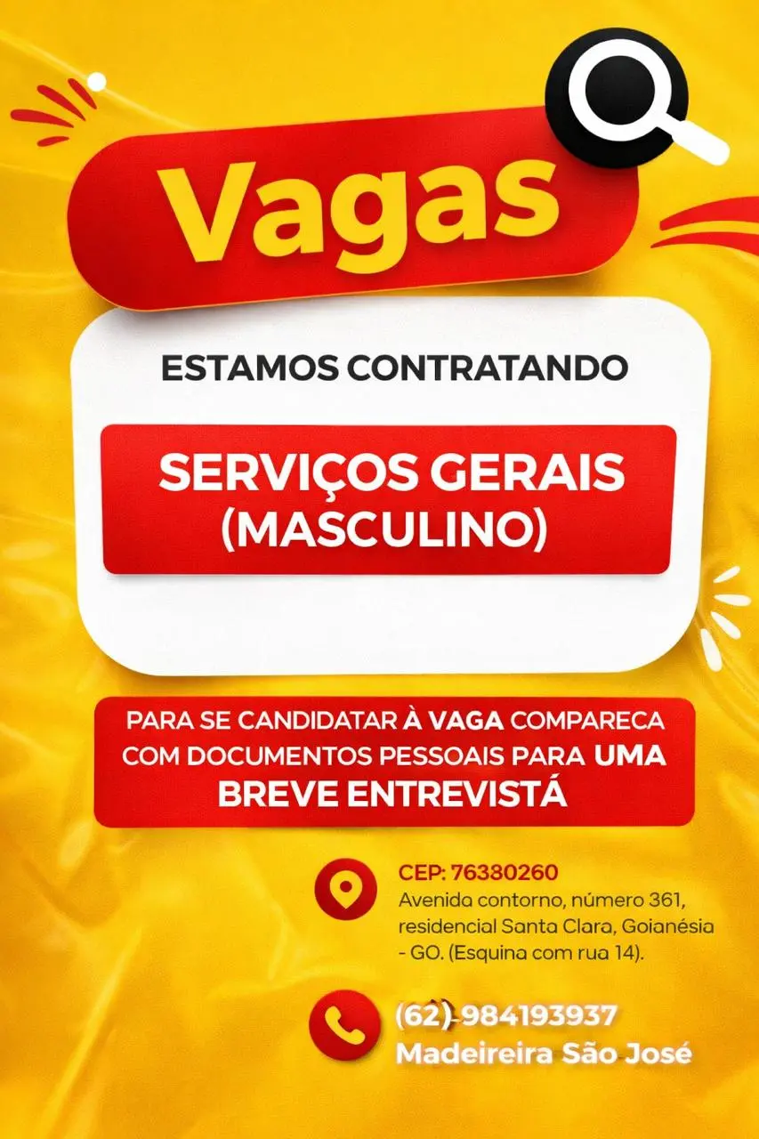 Uma empresa do setor comercial está com vaga aberta para a função de serviços gerais em Goianésia. A oportunidade é destinada ao público masculino e prevê contratação imediata, conforme divulgado.
